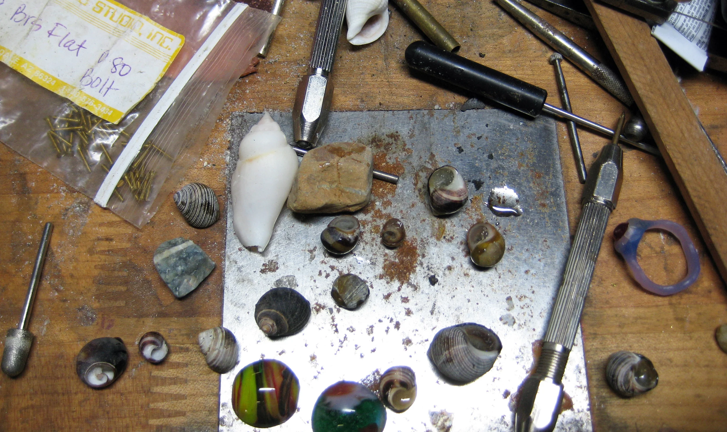 I spent many years working in jewelry stores as a custom goldsmith and stonesetter. I learned that almost all forms of stonesetting mechanically entrap the gem. At some point, I realized that I could utilize many of those traditional techniques to hold other types and shapes of objects. I am endlessly intriqued with coming up with imaginative ways to entrap found objects. Besides traditional stonesetting techniques, I love using miniature nuts & bolts, taps & dies and whatever else I can figure out.